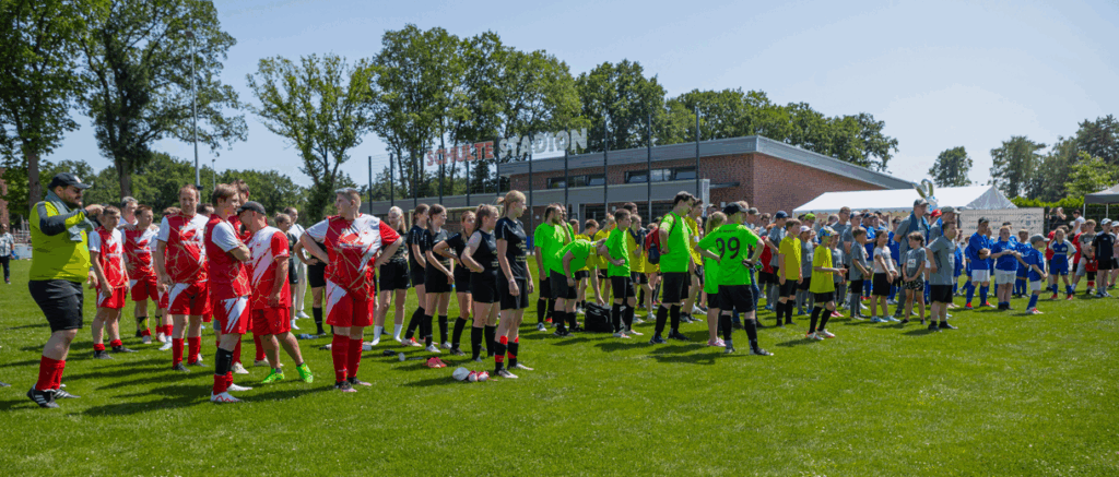 Zur Begrüßung versammelten sich alle zehn teilnehmenden Teams auf dem Feld. In einem kurzen Rückblick ließen die Lünnis die vergangenen zehn Jahre Revue passieren. Auch der Bürgermeister fand wertschätzende Worte und eröffnete mit viel Begeisterung das Turnier.